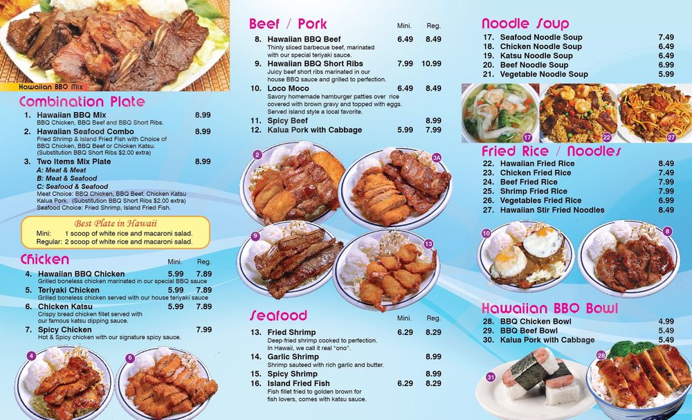- Combination Plates: Delight in the Hawaiian BBQ Mix, featuring BBQ chicken, beef, and short ribs, all served with rice and macaroni salad.